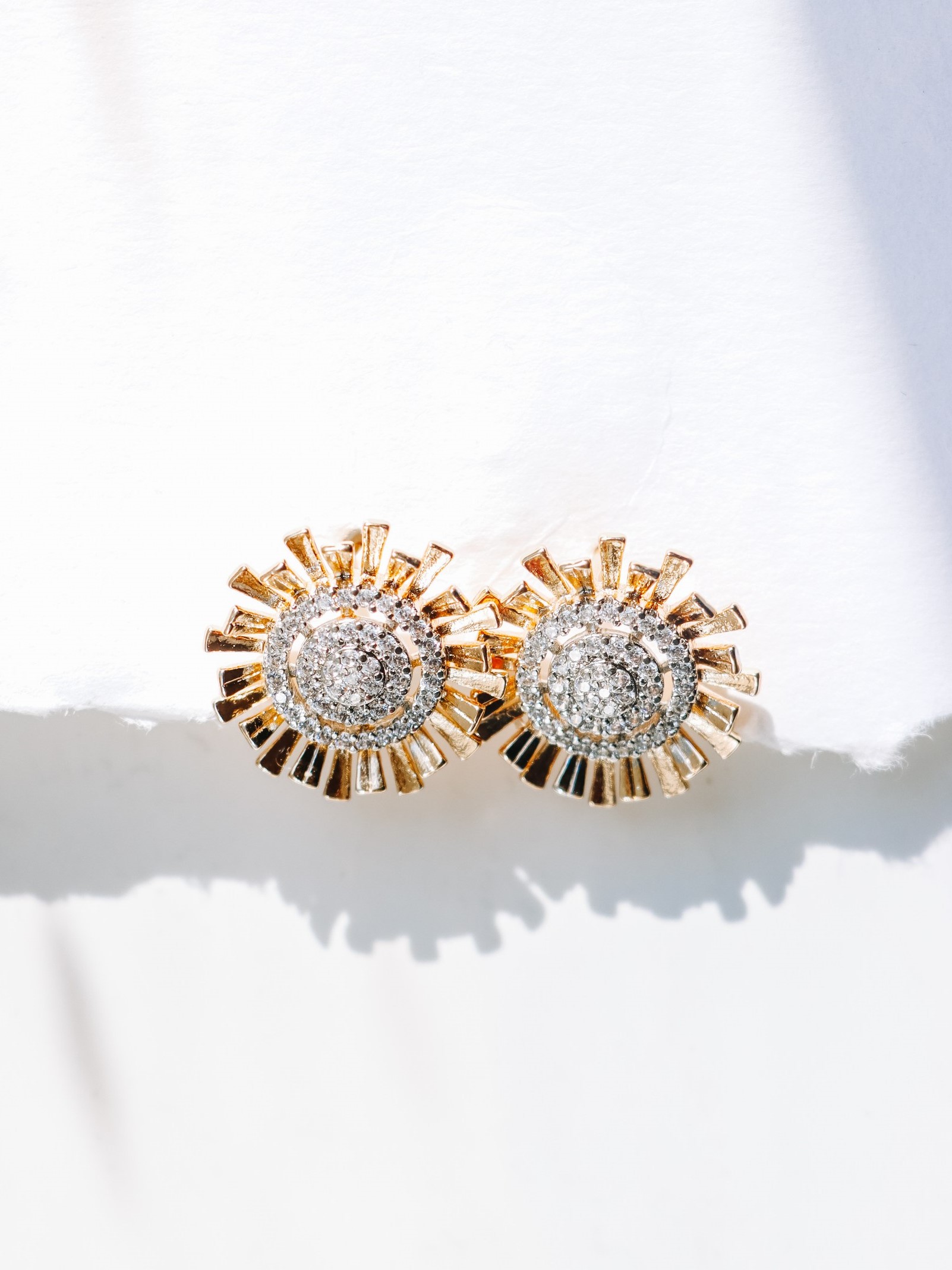 Moderni, apzeltīti auskari ar saules motīvu. Radīti sievietēm, kas novērtē vieglu dizainu un kvalitatīvus, antialerģiskus materiālus.