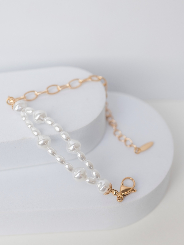 Apzeltīta rokassprādze ar ķēdes ar pērļu elementiem.
